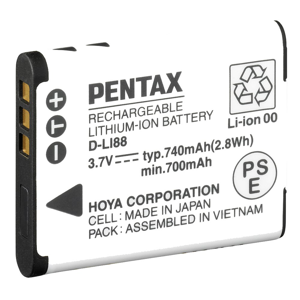 Image: The Pentax D-LI88 Li-ion Battery. This image shows the compact design of the rechargeable battery, which is essential for powering compatible Pentax digital cameras.
