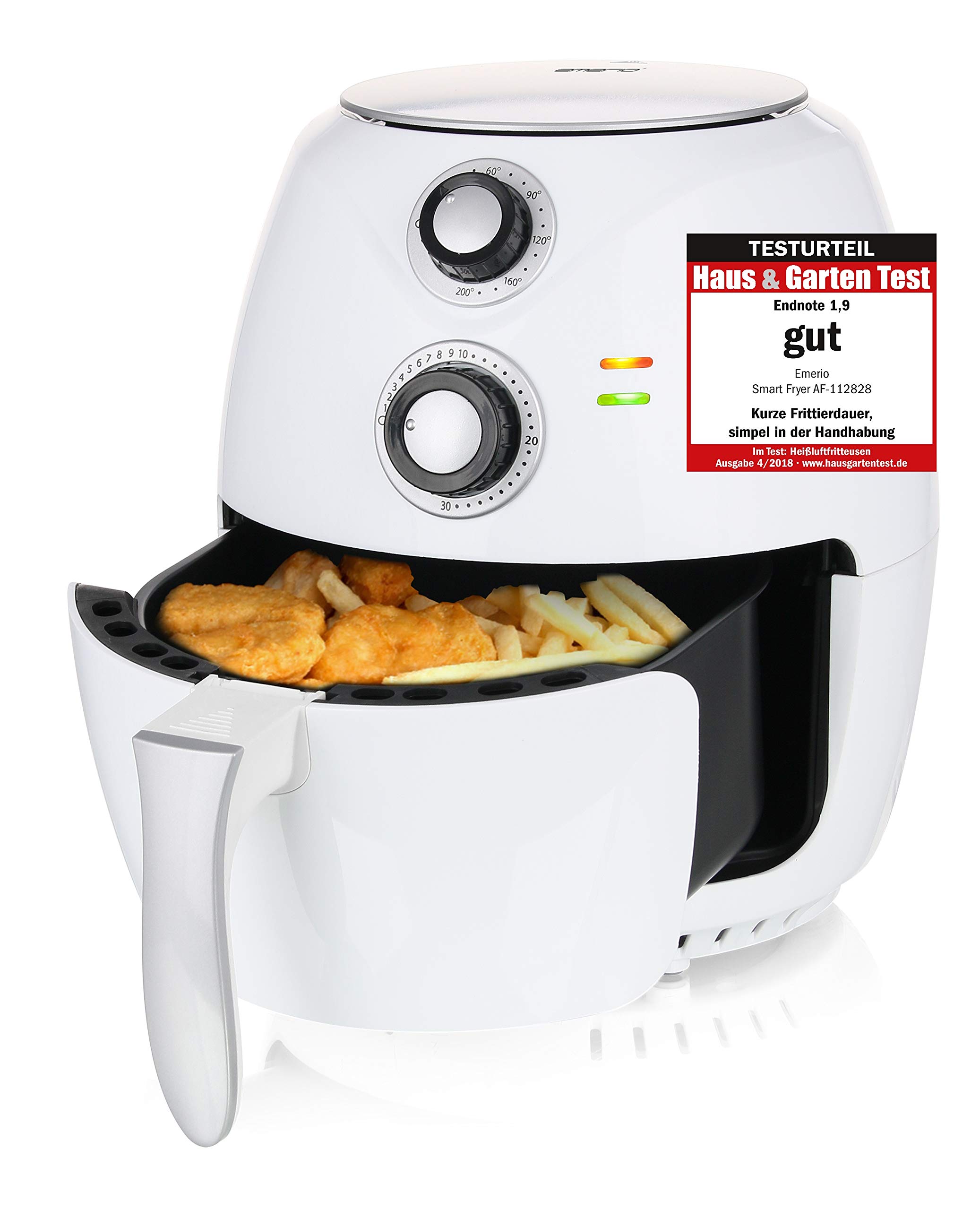 Image: The Emerio AF-112828.3 Airfryer with its frying basket partially removed, displaying cooked chicken nuggets and french fries. A small plate with additional food and ketchup is visible next to the appliance.