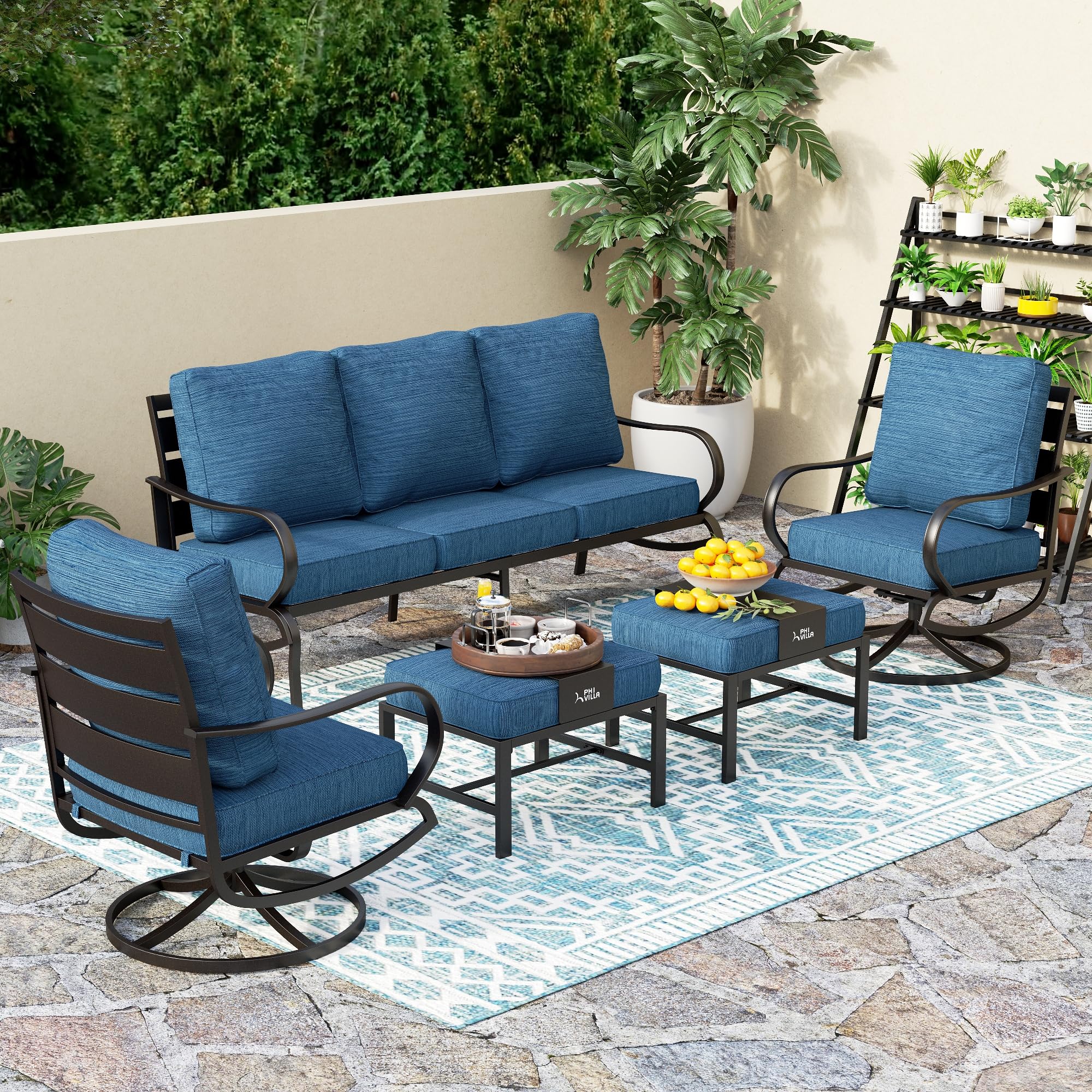 This set includes one 3-seater deep seating bench, two swivel sofa chairs, and two metal cushioned ottomans, designed for outdoor use.