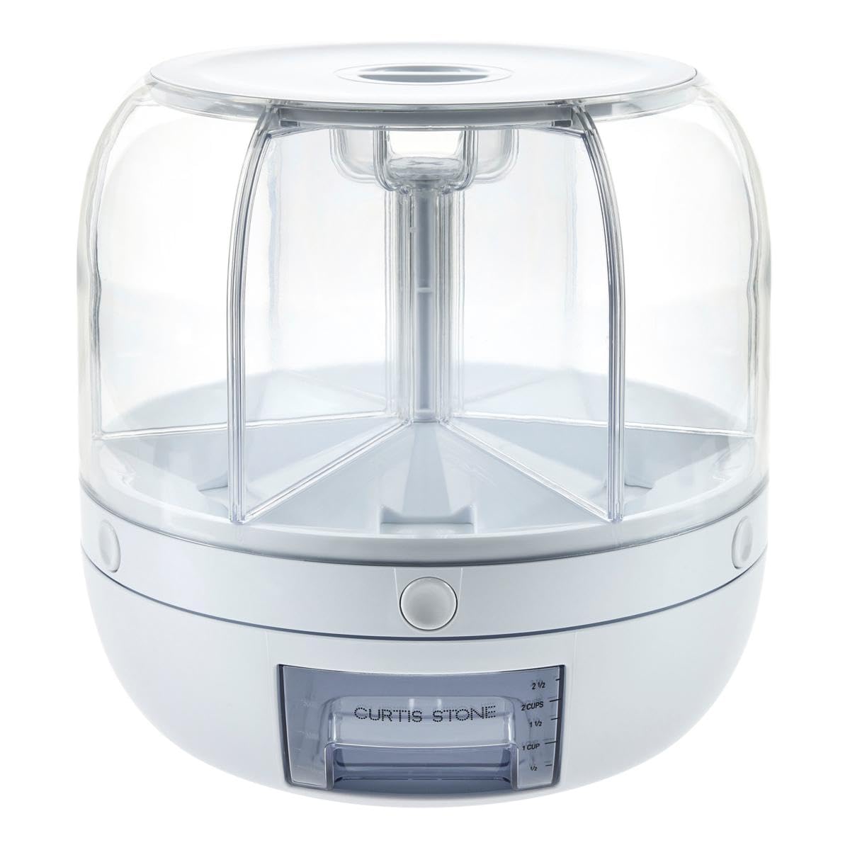 The Curtis Stone Dry Grain Dispenser features six individual compartments for organized storage of different dry ingredients. Its transparent design allows for easy monitoring of contents, and the 360-degree rotation provides convenient access to all compartments.