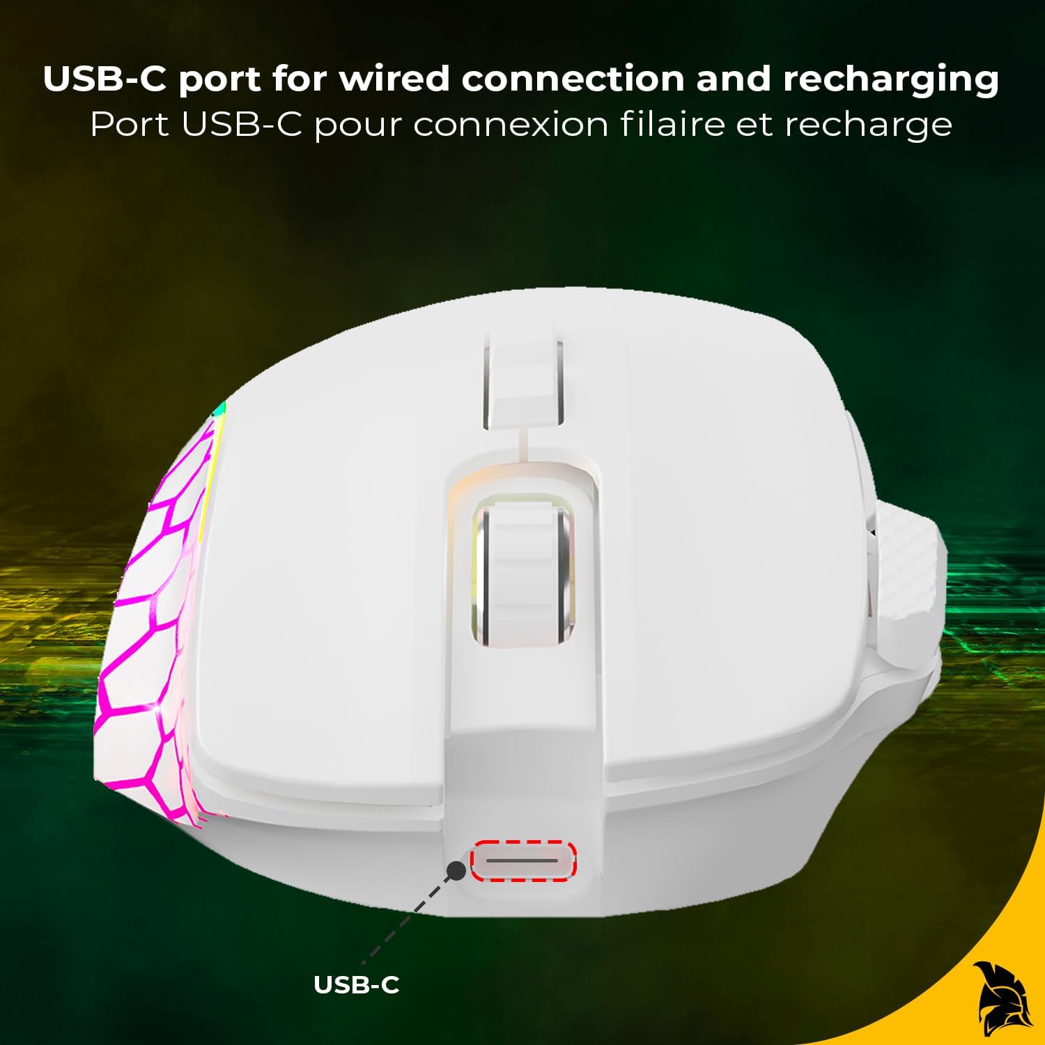 This image highlights the USB-C port located at the front of the mouse, used for wired connection and charging the internal battery.